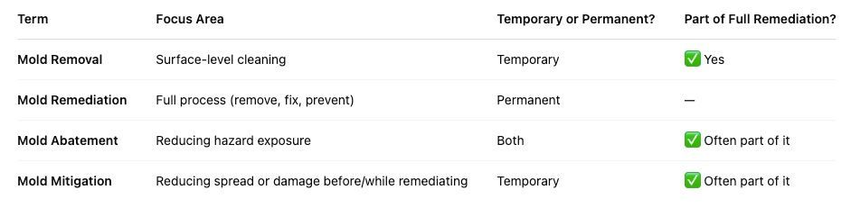 - Focus: Can include temporary or permanent measures to reduce mold exposure.